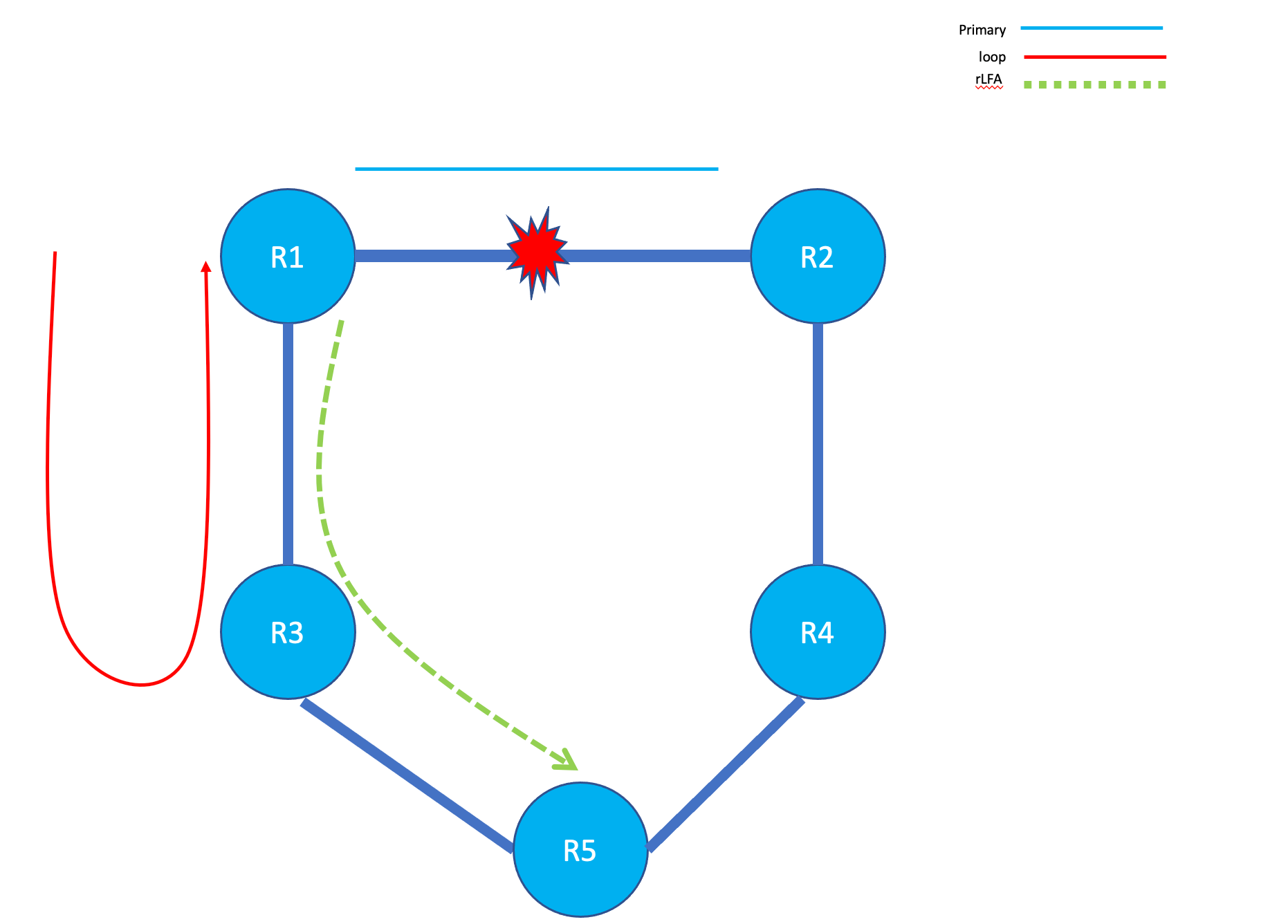 In the following network diag, R1 has a primary path towards R2 to reach a prefix connected on R4. The primary path breaks and ISIS on R1 needs to converge the path towards R3 to reach the prefix on R4. As per the Cisco website, this can take many 100 milliseconds as the path needs to be calculated by ISIS, and then it should update RIB and FIB. Until the path is updated in FIB the traffic destined to that prefix will be dropped. With ISIS fast reroute LFA, the whole path calculation step is skipped and the traffic is just rerouted to a pre-computed path which is always present in the FIB as repair path. Something like below.